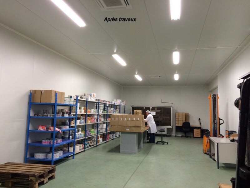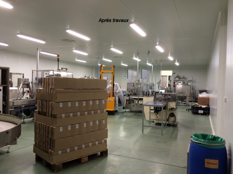 Dans une ancienne usine, nous avons habillé les murs et les plafonds de panneaux sandwich pour créer des zones « propres » de production et de conditionnement. Nous avons aussi réaménagé les zones de stockage et les locaux sociaux.